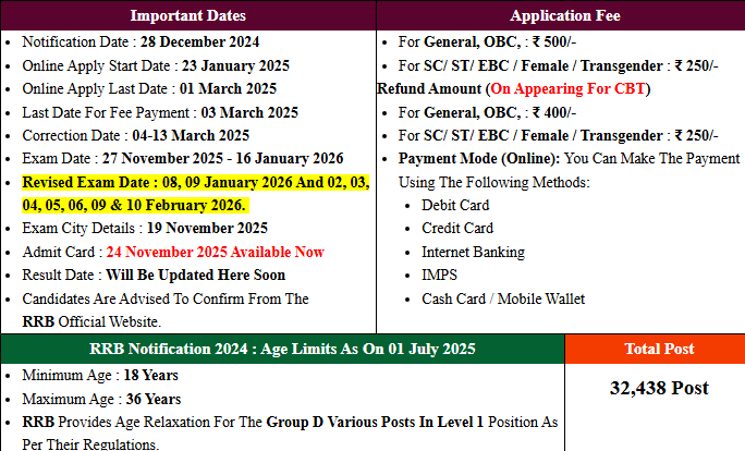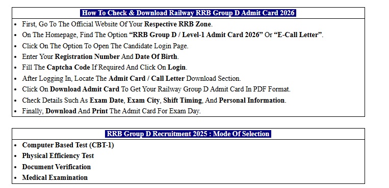 Railway Recruitment Boards (RRB), has released the Admit Card on its official website for the Recruitment of RRB Group-D Exam 2026. The exam will be conducted 27 November 2025 – 10 February 2026, and the last date to submit the application form was 01 March 2025.