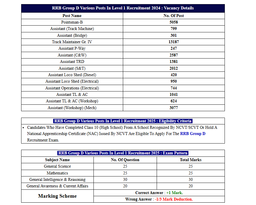 Question: What posts are covered under RRB Group D recruitment?Answer: Group D includes posts like Track Maintainer, Helper, Assistant Pointsman, and Level-1 staff in railways.